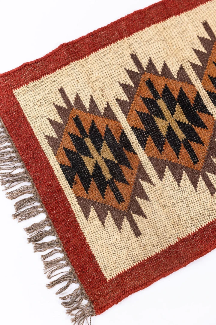 Kilim Rugs are handwoven outside a small village in Jaipur, India. These flat-woven rugs embody a splendid mix of cultures: the Greeks, Armenians, Kurds, Assyrian, & Turkic peoples have all contributed to kilim history. Each rug is hand-woven/loomed in jute with rich warm colors to compliment various decors and doubles as a wall hanging.