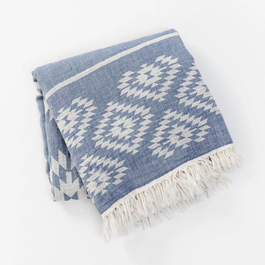 The dual-sided Theoria Throw can be used as a bath/beach towel or as a scarf. Lightweight, absorbent, and machine washable. An everyday accessory for your home or travels. This pattern is designed after traditional Turkish Kilim rugs.