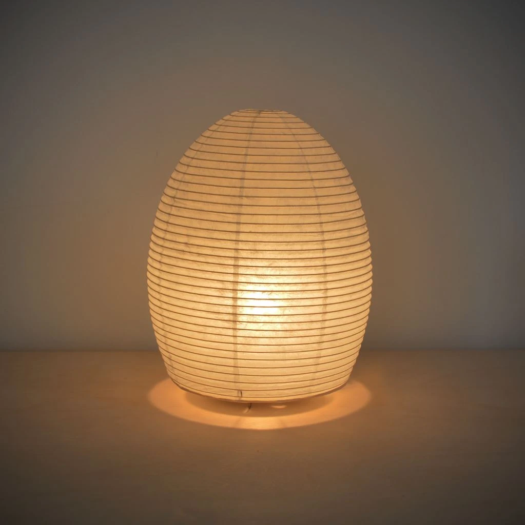 Japanese washi paper lamp shade omitting a warm, ambient light. To be use on table top or floor; switch on cord. Handmade in the Gifu prefecture of Japan for 90 years, this collection table lamps speak softly with their halcyon shape and warm diffusion. The simplicity of their structure is characterized by a wire armature that dilates a continuous spiral of bamboo filament and rice paper. Flat packed and gift boxed, the experience of taking an Asano light out of its box is like unfolding a precious silk.