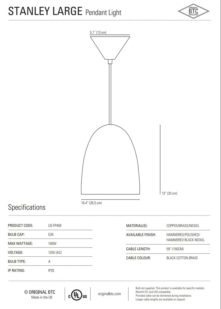 Original BTC is a family-owned and family-run lighting company based in London, England using only the finest natural and raw materials sourced in the United Kingdom for their high-quality, handmade lighting. Each piece of Original BTC’s exemplary table, floor, pendant and wall sconce lighting are crafted with care by ceramicists, metalworkers, and nautical craftspeople dedicated to making only the world’s finest lighting. Original BTC’s lighting is recyclable and is made to last generations using bone china light fittings, solid aluminum, copper, brass, and iron. Each piece of lighting is accentuated by cotton braided cables, exceptional satin chrome bases and a beautiful array of colored shades. All Original BTC’s products are UL certified, all components made in England, and all workers are paid a living wage.