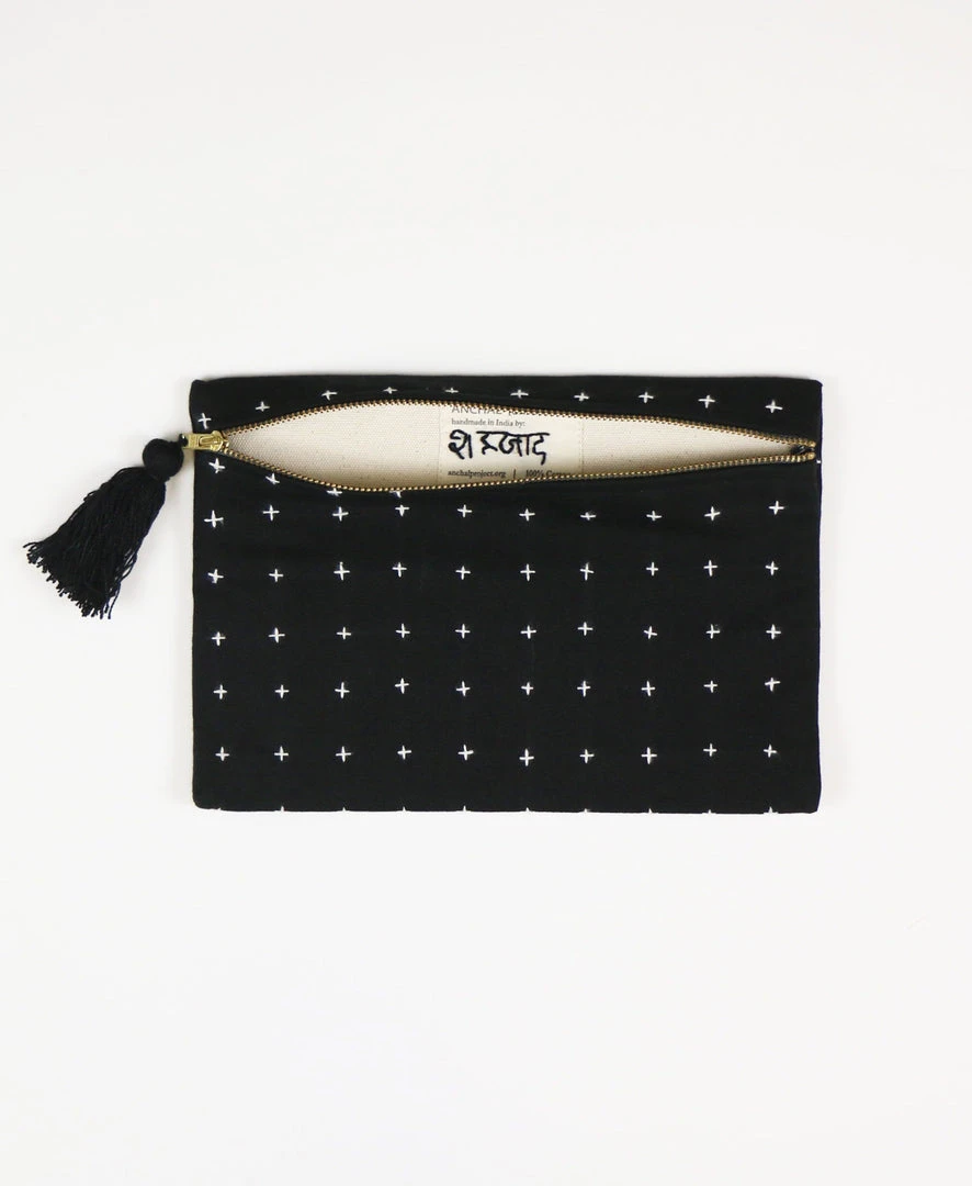 This small pouch clutch features charming cross-stitch details, making it as beautiful as it is functional. Use it to stay organized, store makeup, a cellphone, or important receipts.