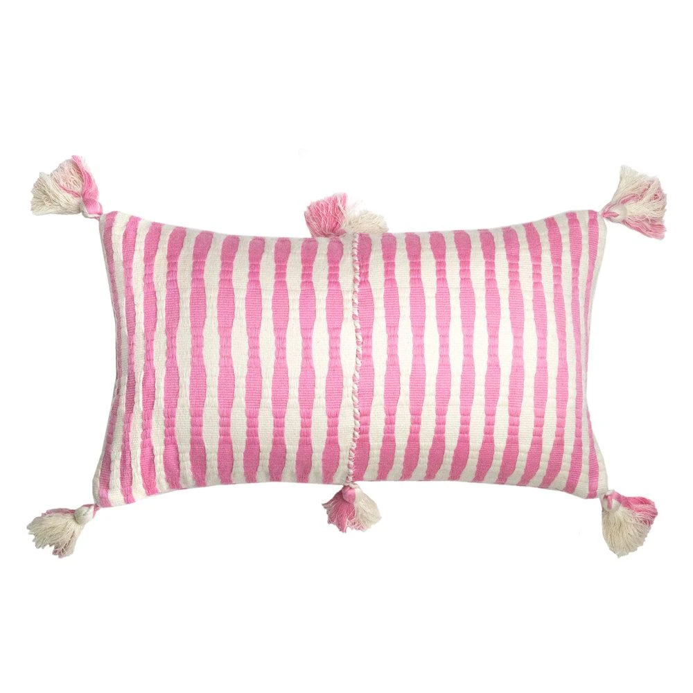 This bubblegum pink pillow is inspired by traditional textiles from Almolonga, Guatemala. The cotton used to make this pillow was handwoven by artisans using a back-strap loom.