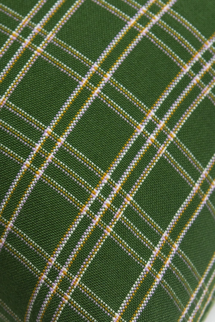 Forest green plaid throw pillow, ethically handwoven by artisans in Chiapas, Mexico on traditional footlooms. With hints of ochre and burgundy, this update on a classic plaid will be a lively addition to any decor.