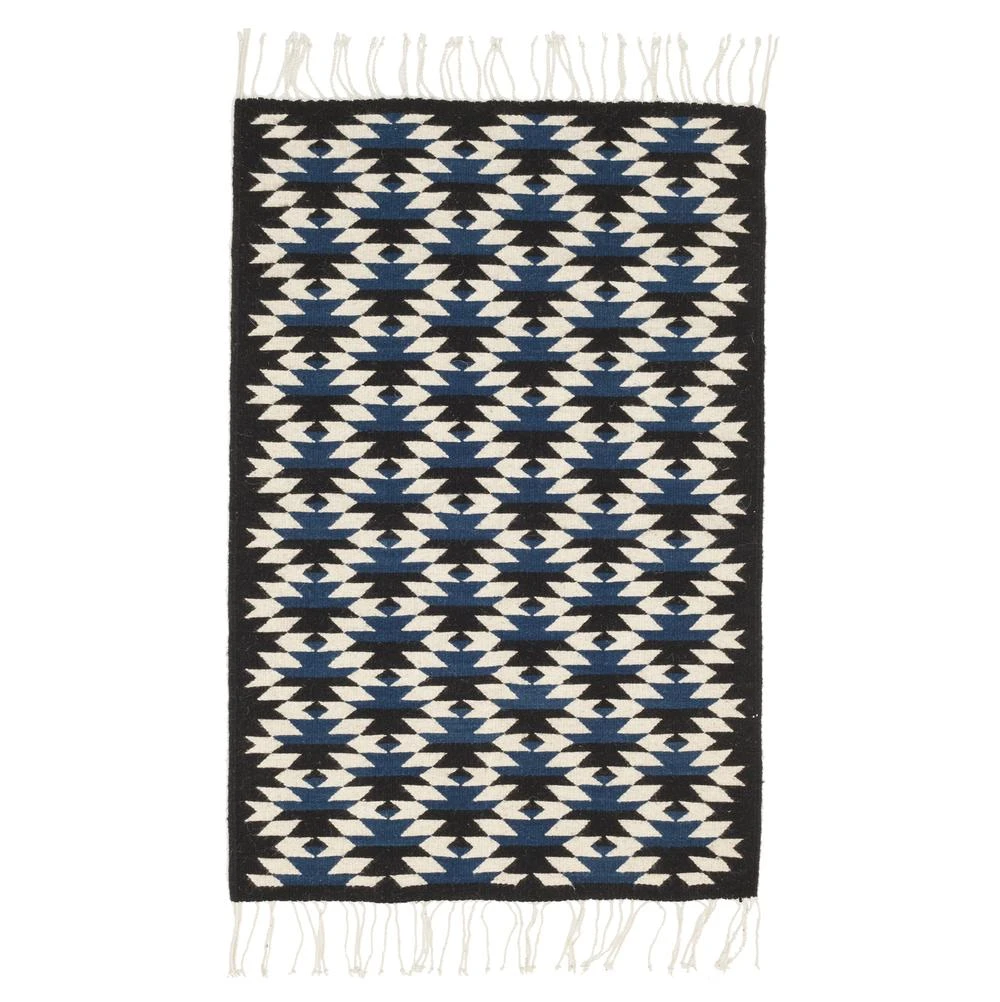 This flat weave wool rug is made by artisans in Mexico. The design features a motif from a Rio Grande style rug from the 1800s.