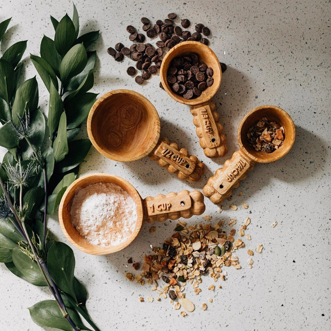 The Ruby Wooden Measuring Cup Set features raised measurements and beaded detail handle edging that will not only help you cook up precious memories but also display the artistry of woodcarver artisans a world away. Finished with all-natural beeswax polish.