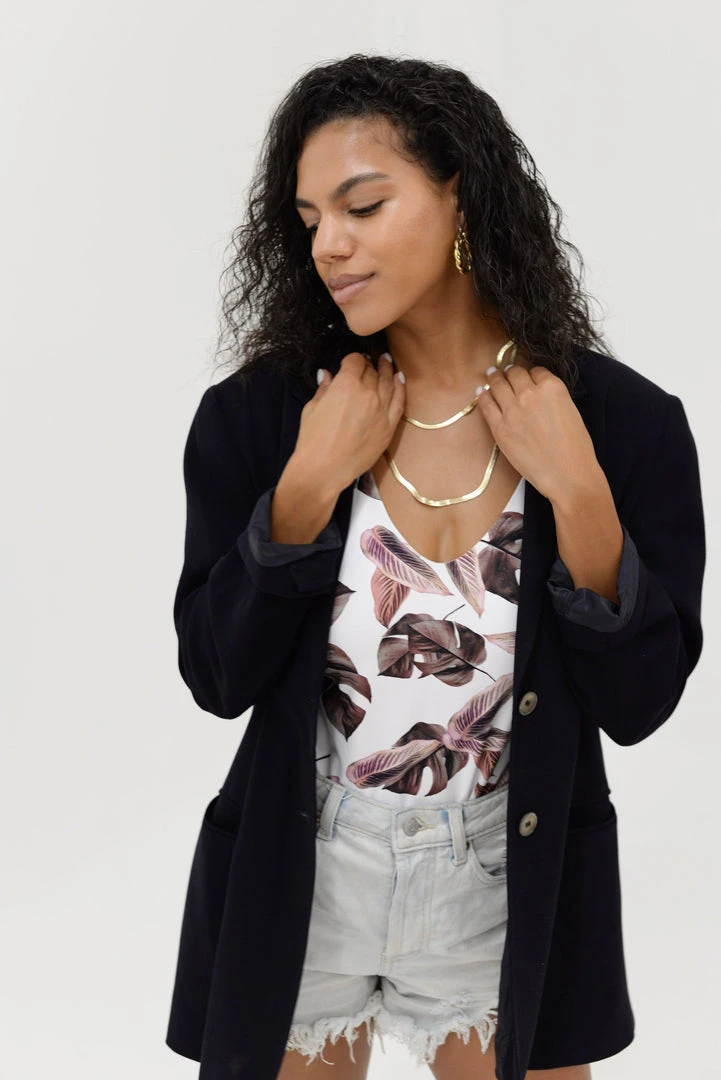 The Flora Swimsuit is a flattering, deep plunge one piece swimsuit with a tropical floral design that reverses to a solid taupe. The Flora is complete with textured side rouging ties that give a couture fit, and the high cut leg elongates your frame.