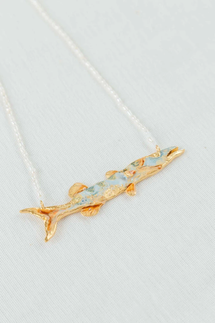 This unique necklace is inspired by the colors and textures of the ocean. Add a bit of shine to any outfit with this handcrafted, responsibly sourced piece. The barracuda, also known as the tiger of the sea, is long, fast, and enjoys being close to coral reefs where she’s able to hide and surprise her prey.