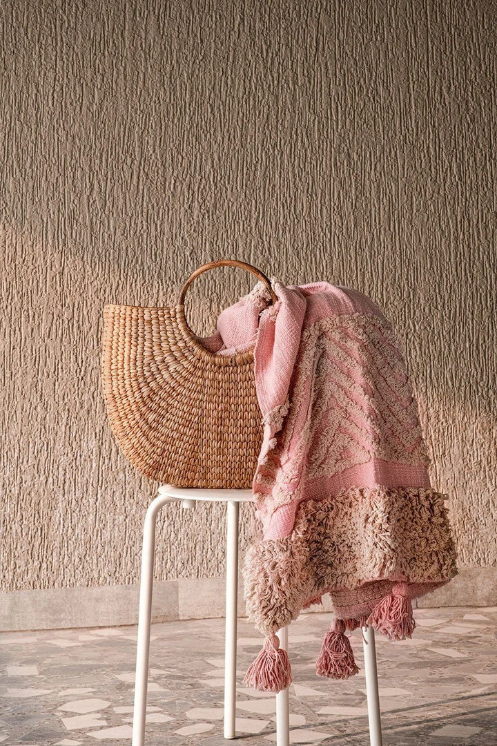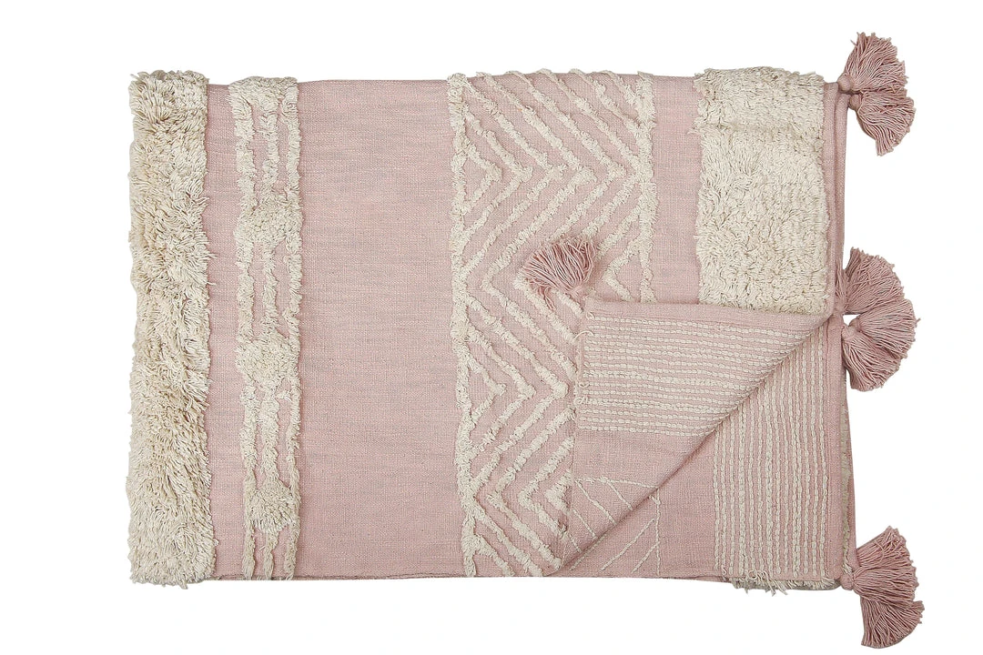 This handmade blush throw blanket features tufted detailing on a soft cotton slub base that invites you to wrap it around your shoulders on a cold night. Tassels at the edges bring texture and whimsy to any living space.