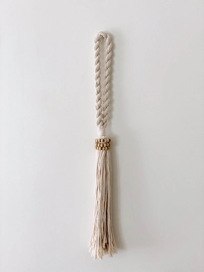 This beaded tassel is the perfect bohemian accent to a table or bookshelf. They also rest nicely on a nightstand or ottoman, can be hung on a wall, or even used as curtain ties. The unique shell is sourced in Java and brings a rich global feel into the home. Each individual bead is hand-carved, and then strung, and tied to a 100% cotton tassel to make these beautiful accent pieces.