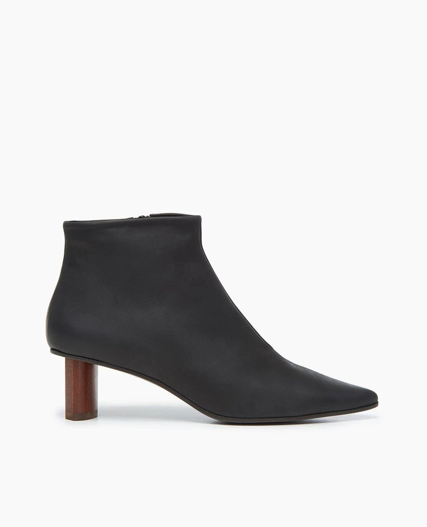 A timeless day-to-night wardrobe essential, the Whoop pointed toe ankle bootie is made up in supple black leather. Featuring a sculpted solid wood oval heel in an elegant chestnut hue. Wear casually with cropped raw-edged denim or dress her up with silky lounge pants.