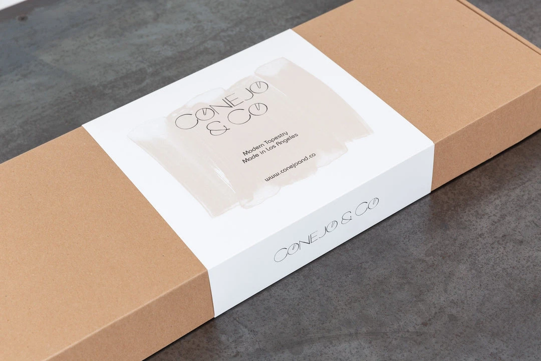 These contemporary, three-panel wall hangings are hand-painted in Los Angeles using metallic gold, light, and dark green artist’s acrylics and graphite on beige linen. The raw, solid brass hardware was machined in Los Angeles as well. Each piece is made just for you, making them one of a kind.