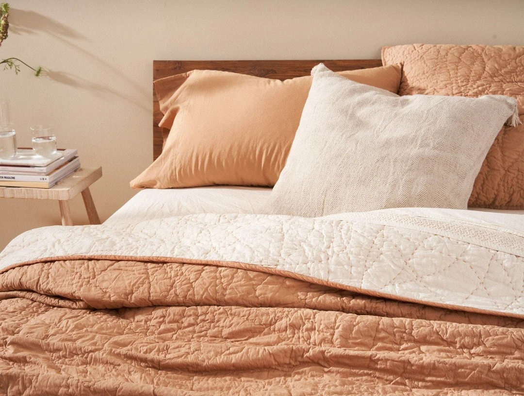 Inspired by the sculptural art of basket-weaving, this organic cotton quilt mimics the imperfect, organic curves of nature. Handstitched kantha thread is quilted throughout, creating a reversible product with contrast stitching that stands out against the undyed backing. Like crinkled percale fabric, this woven quilt has a relaxed drape that embraces its casual feel with every wash. Mid-weight and perfect for layering, with a simple ½” binding.