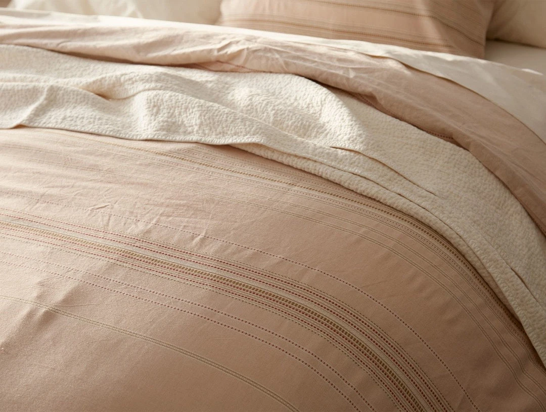 Organic cotton chambray is detailed with textural dobby-woven stripes. Each stripe is composed of a series of small geometric patterns. Refined texture is yarn-dyed for lasting color. Backed with plain weave chambray.
