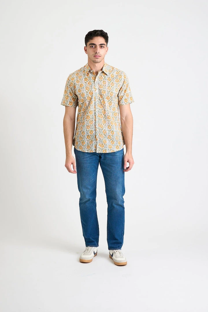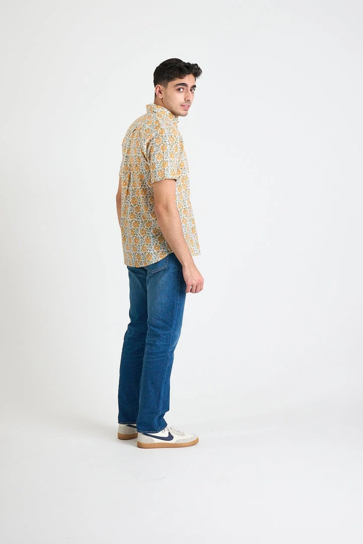 The Prat Short Sleeve Shirt is an everyday shirt with an elevated look. Featuring a Citrus colored floral design that is hand screen printed in small batches, which naturally have inconsistencies giving this shirt an elevated handcrafted look. Please note that the actual color of the shirt may differ from the pictures due to computer lighting and hand-made nature of the fabric.