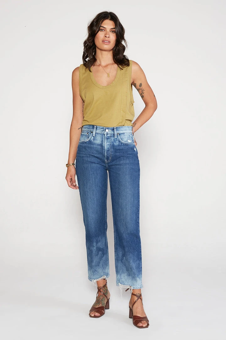 A straight leg jean with a high rise and vintage construction finished with thoughtful destruction and dimensional eco wash technique.