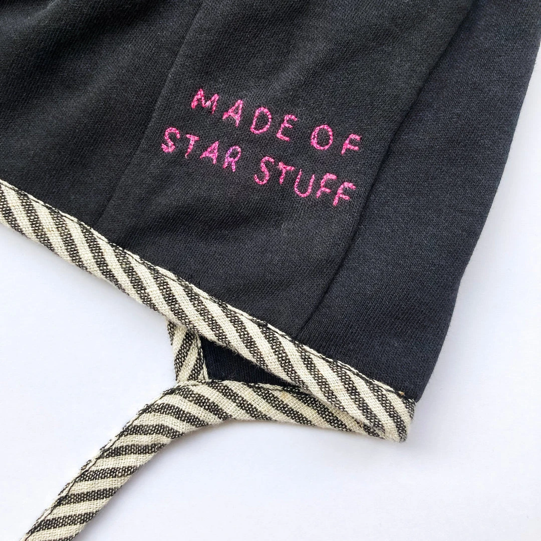 Wrap your little dreamer in a warm layer that brightens up chilly days. The Moon and Stars organic cotton bonnet features appliquéd cotton moon and stars layered over black cotton jersey, with hand-guided machine embroidery. Motifs inspired by quilts of the mid 19th Century, whose makers drew comfort from the patterns found in nature.Â