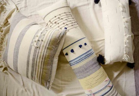 We love this minimalist black and white organic cotton pillow. It has fun textures and large woolen tassels that catches your attention. The fabric is made from organic cotton that is hand spun and woven by artisan weavers on the handloom.