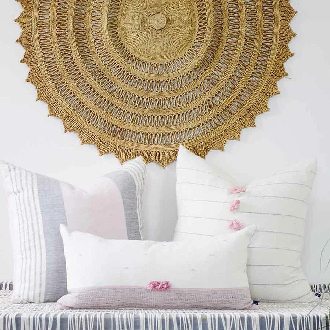 The blush pink Shanu decorative pillow is hand woven on the loom. The organic cotton yarn was first naturally dyed by hand and then used on the loom. Tiny pink tassels added, makes this an elegant and chic pillow for a beautiful setting.