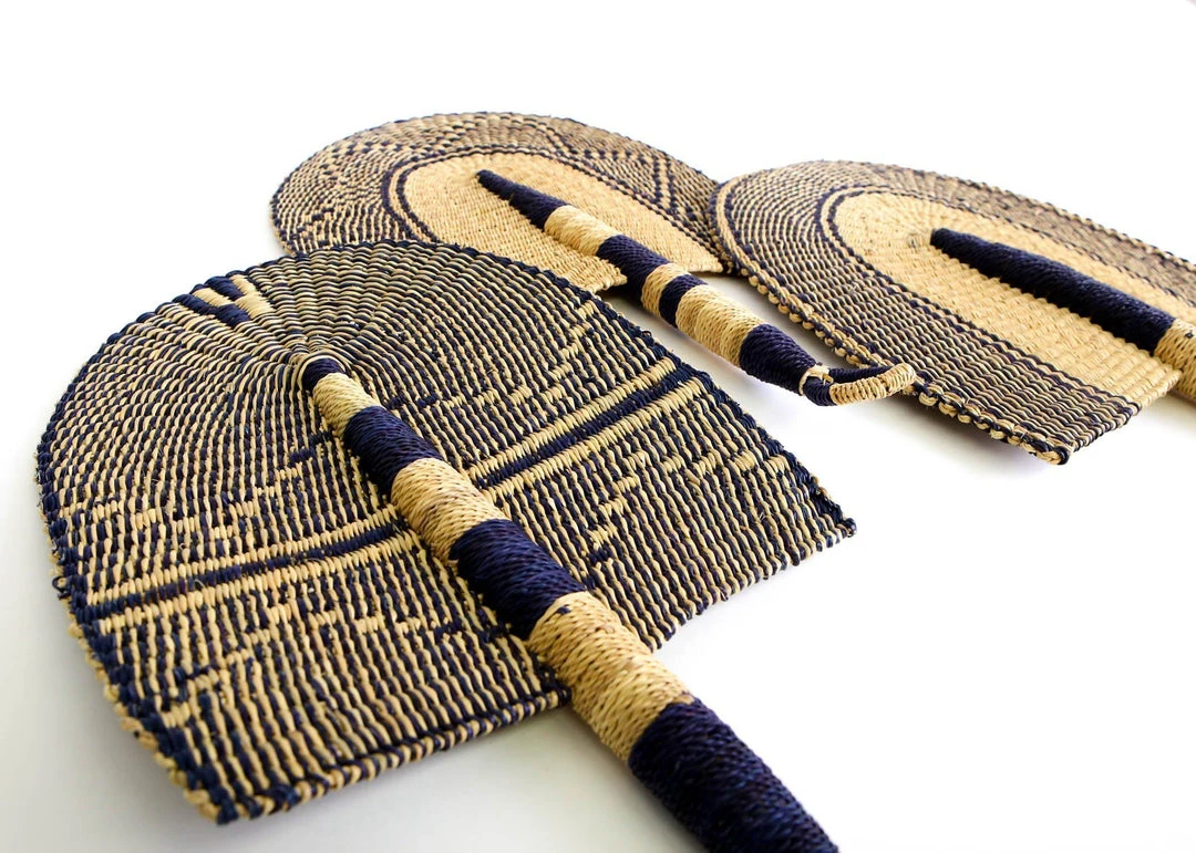 Style a patterned navy Ghanian fan on a wall either alone for a minimalist look, or with other wall art for a dynamic look. Try it on a bookshelf to create a textured display.