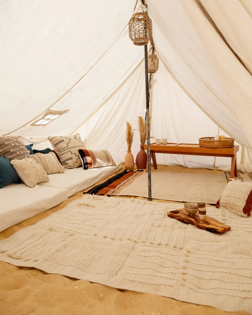 All of Kiliim’s products are handcrafted, which makes each product unique. All cotton in Kiliim products is premium Egyptian cotton sourced from the local markets, and then rolled, spun and dyed in digital dye houses in Cairo. All of the colored wool yarn in their rugs and pillows is spun from upcycled remnants from Cairo carpet factories to make use of fibers that may otherwise be discarded.