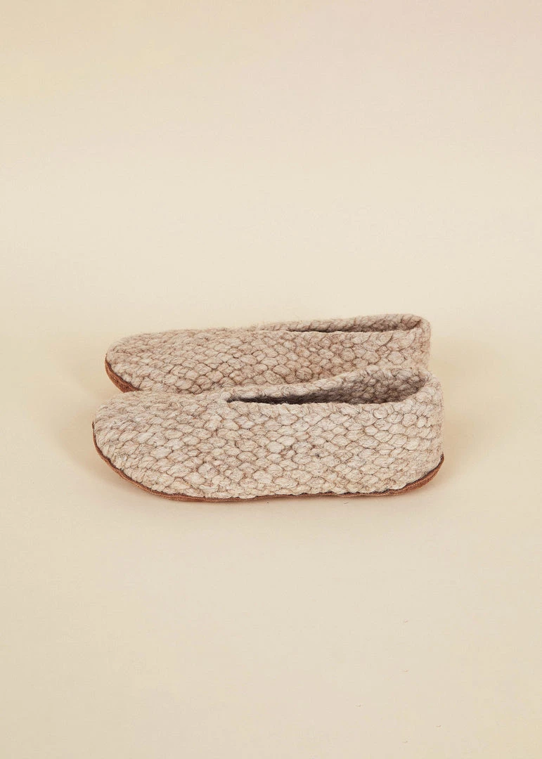 These woven house shoes are Kyrgies’ softest pair yet, made with a thick woolen yarn and a vegetable tanned leather sole. The knit makes them flexible to accommodate delicate and wide feet, while making them easy to pack up and bring along on a trip. The woolen material is naturally moisture wicking and odor resistant to keep you comfortable all year long.