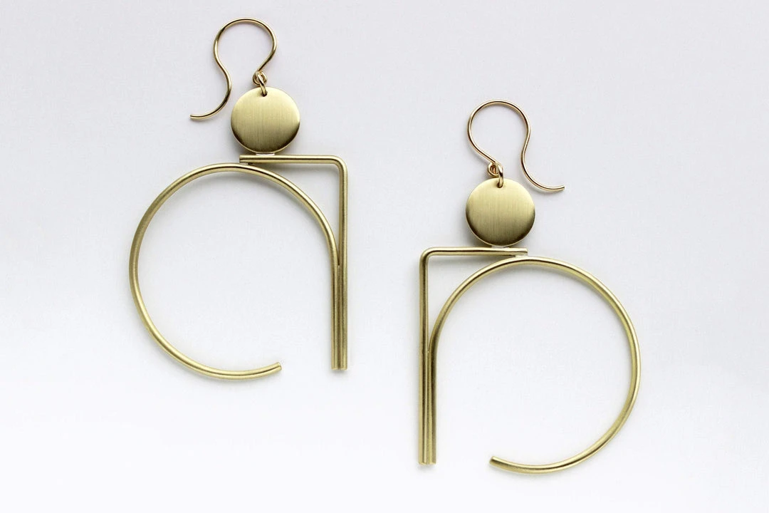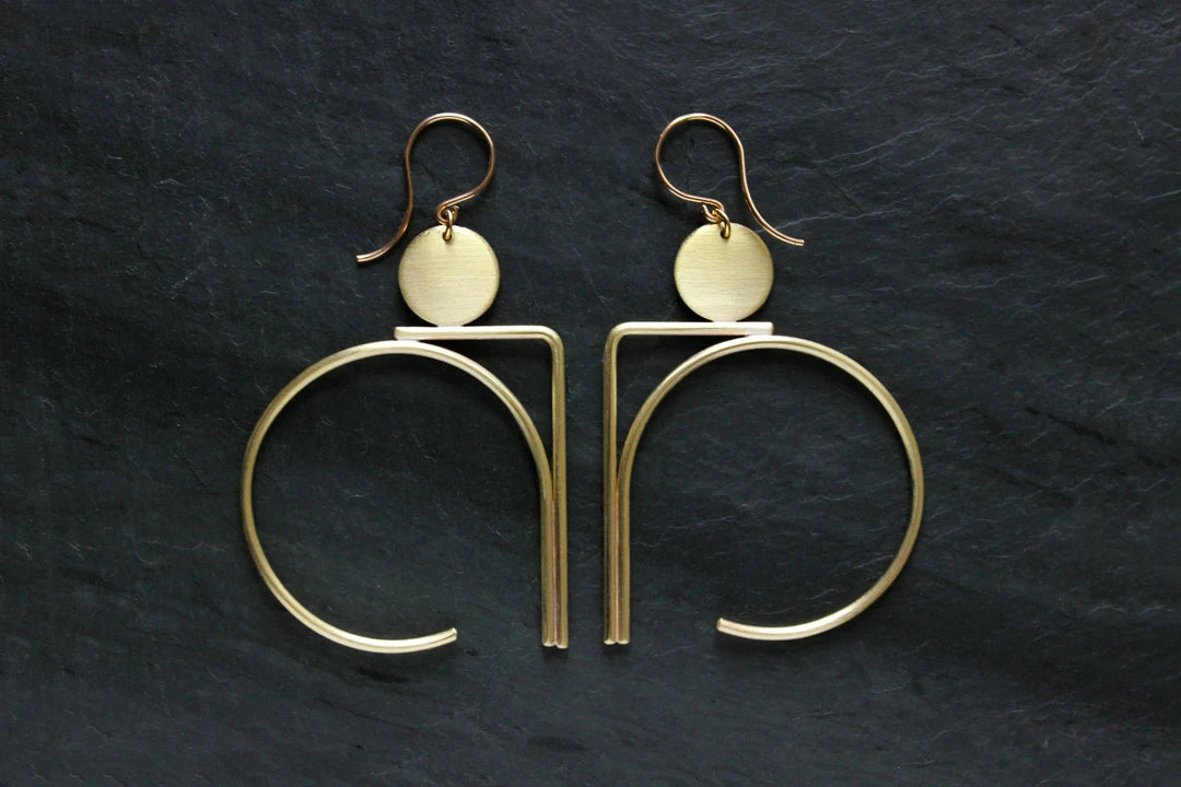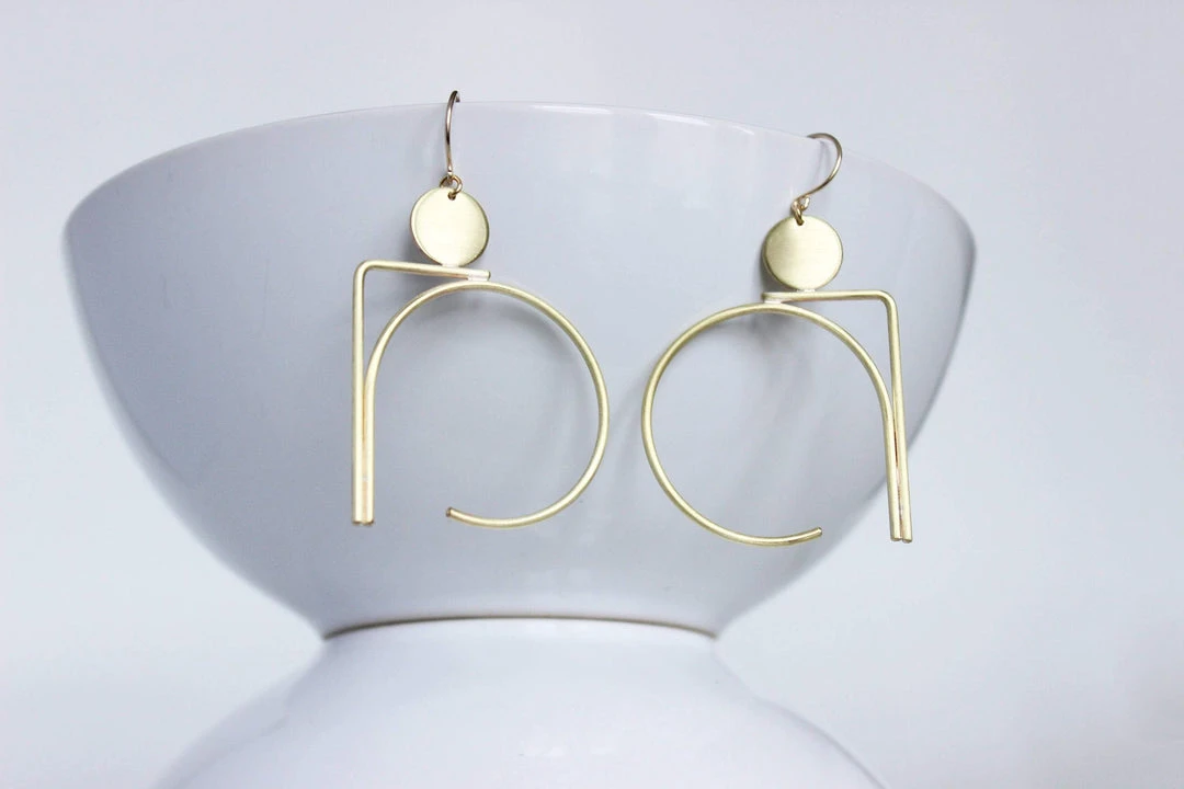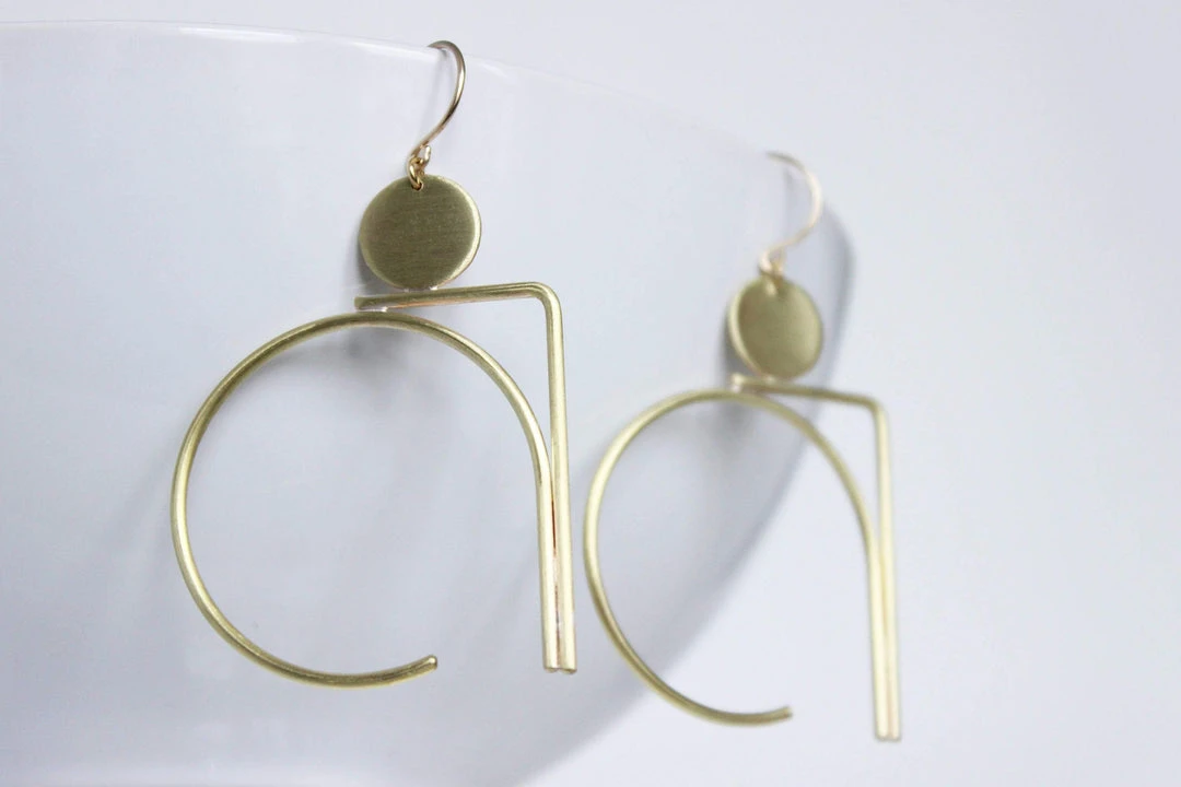 Formed and soldered brass or sterling silver earrings. These geometric statement earrings are simple yet unique. Easily dressed up for a night out or worn with a t-shirt and jeans to add shine to a casual look.