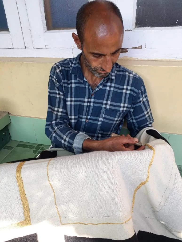 This modern, geometric tapestry has been ethically hand-embroidered by artisans in Kashmir, India, using a traditional embroidery technique that is native to this region.