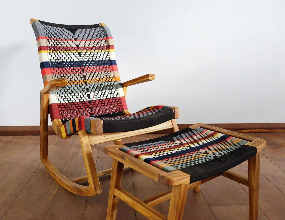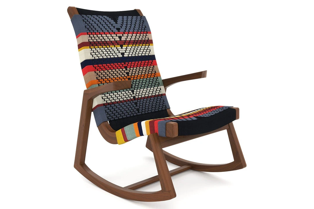 This handmade rocking chair features mid century modern style and is crafted from sustainably sourced wood. Its curved design is perfect for relaxing while its handwoven pattern adds tasteful color to any room. San Geronimo pattern is inspired by the traditional festivities for the patron saint of the town of Masaya.