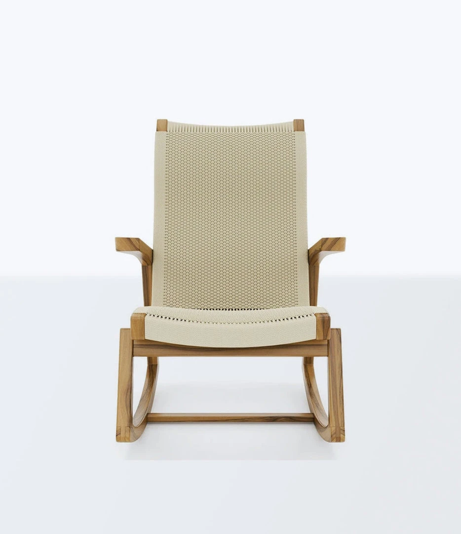 This handmade rocking chair features mid century modern style and is crafted from sustainably sourced wood. Its curved design is perfect for relaxing while its handwoven pattern adds tasteful color to any room.