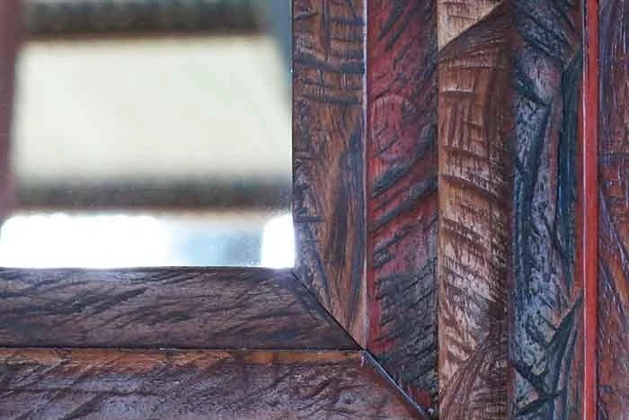A stylish all solid wood framed mirror makes a tasteful hall, living room, or bedroom mirror. The frame is made from a mix of Rosita Walnut, Royal Mahogany and Teak, blended together in a rustic fashion to provide a solid and attractive frame for this large rectangular mirror.
