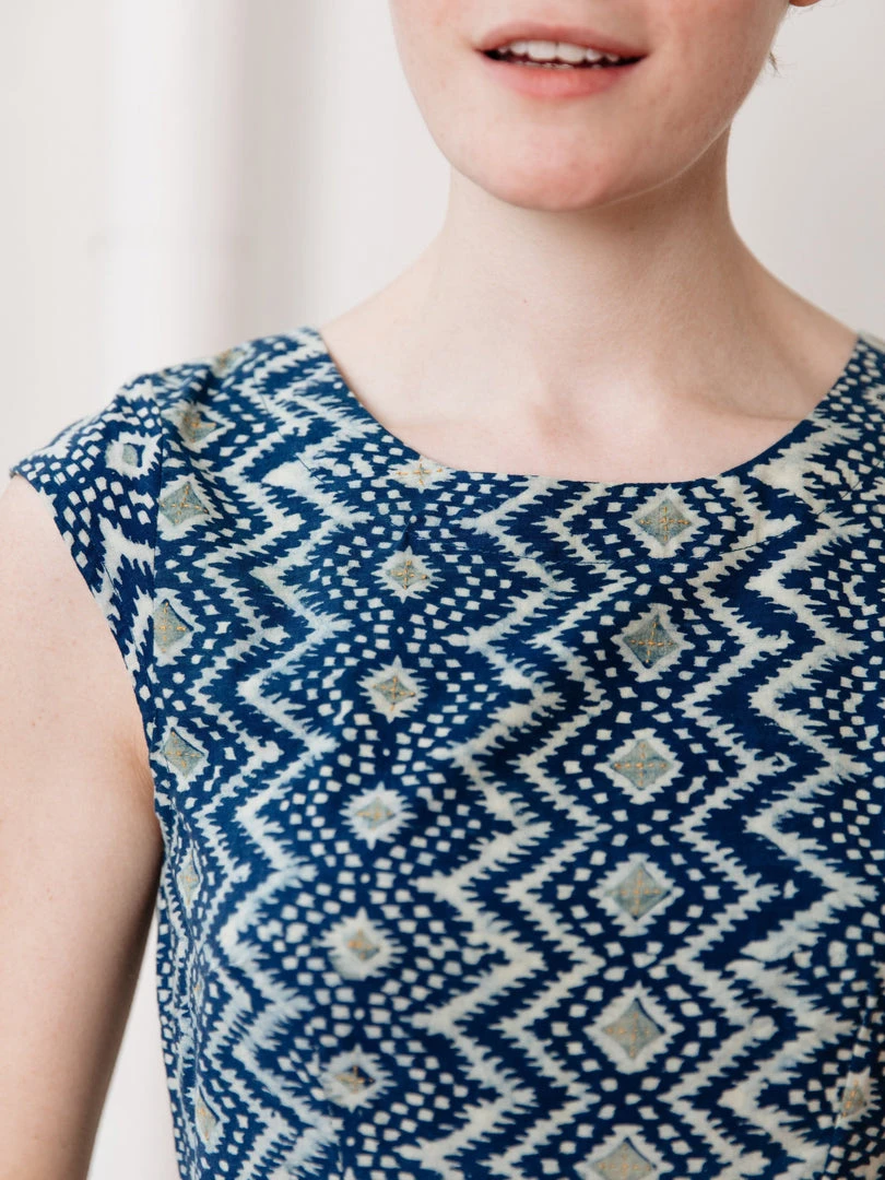 This fit and flare dress pairs a more sophisticated cut with fun details like contrasting hand embroidery and a geometric block print pattern. The perfect look to wear to work, when you know you might be going out after.
