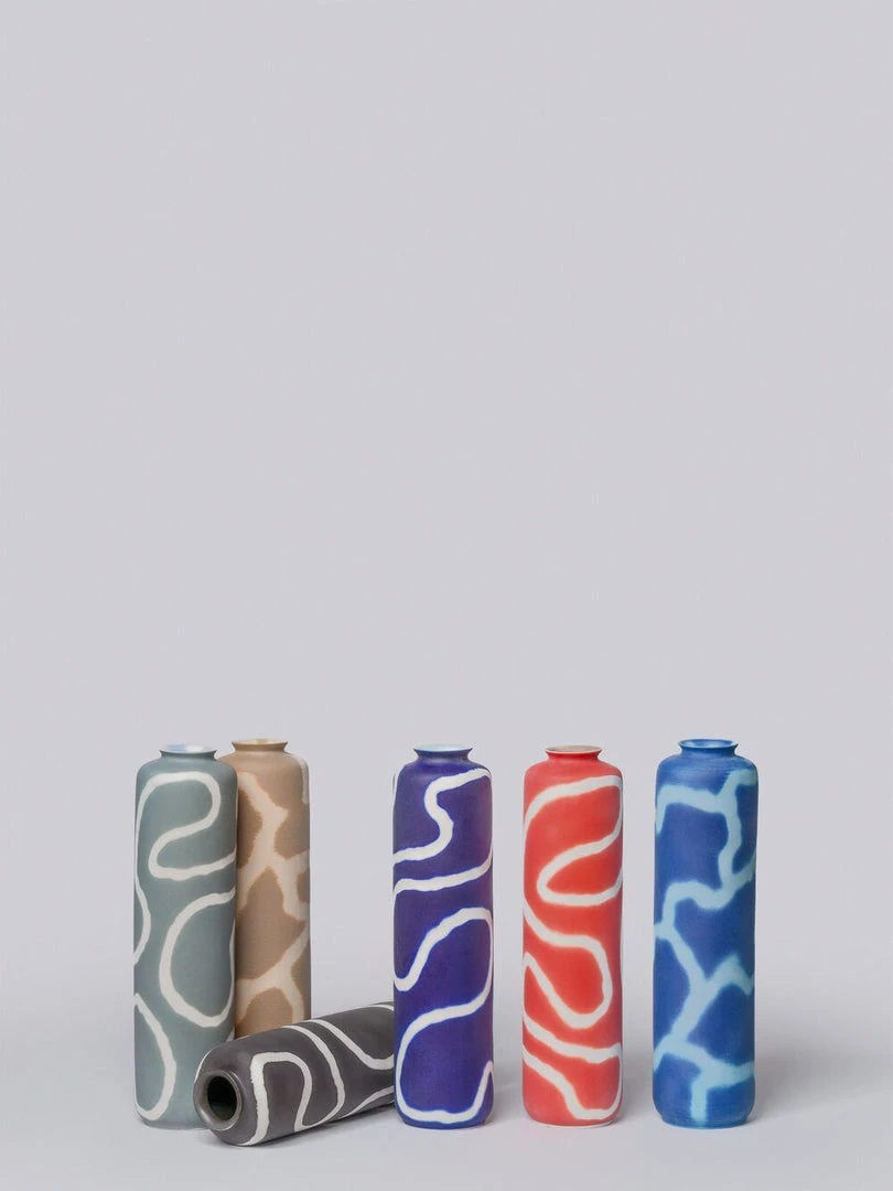 From left steel grey, latte, black, indigo, coral red, and mountain lake.