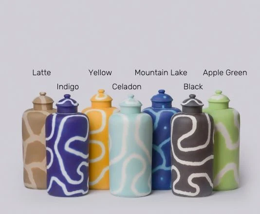 From left latte, indigo, yellow, celadon, mountain lake, black, and apple green.