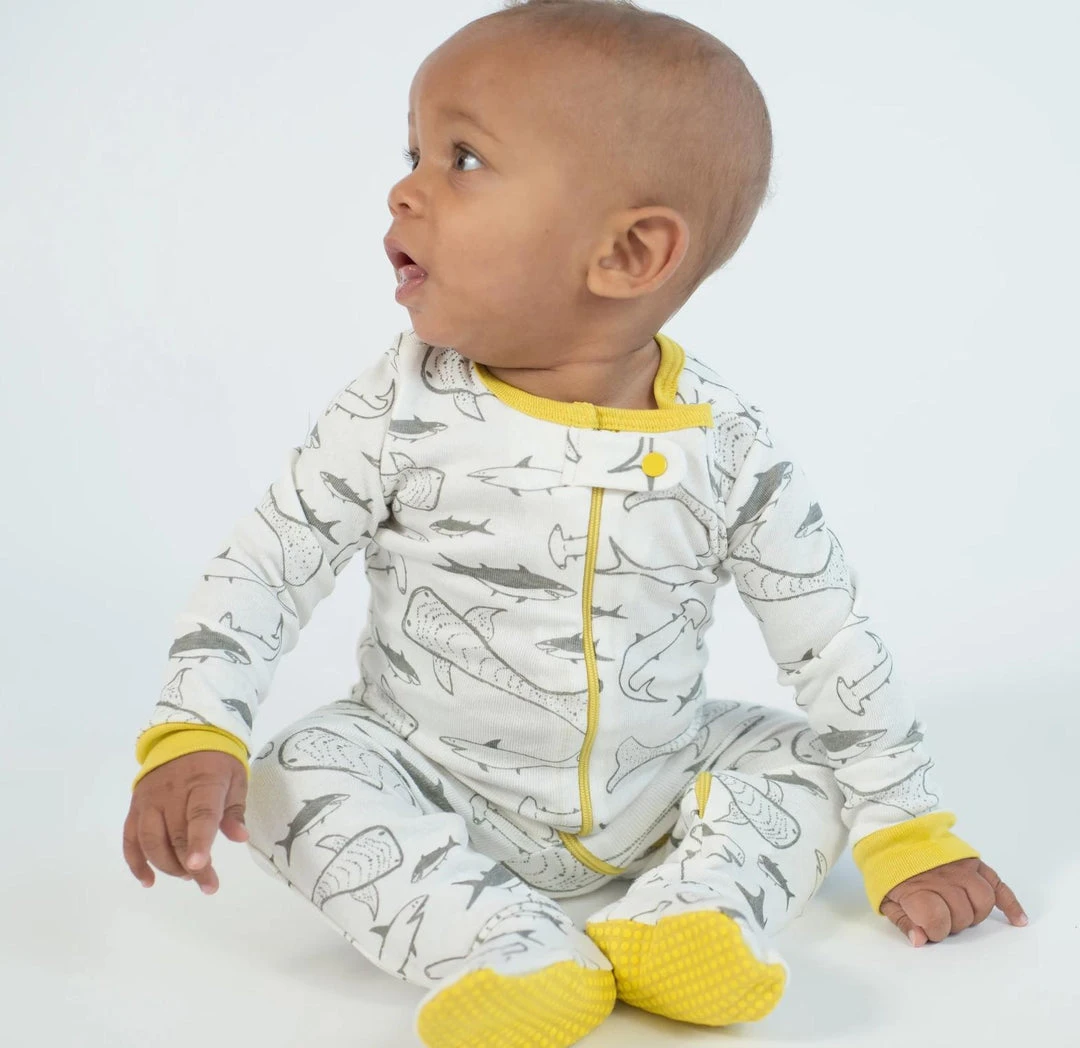 This easy zip-up footed onesies was designed with a dash of adventure. Celery accents in the cuffs, neck, zipper and feet. Grippy feet make exploration safe and fun while the soft organic cotton adds ultra comfort.