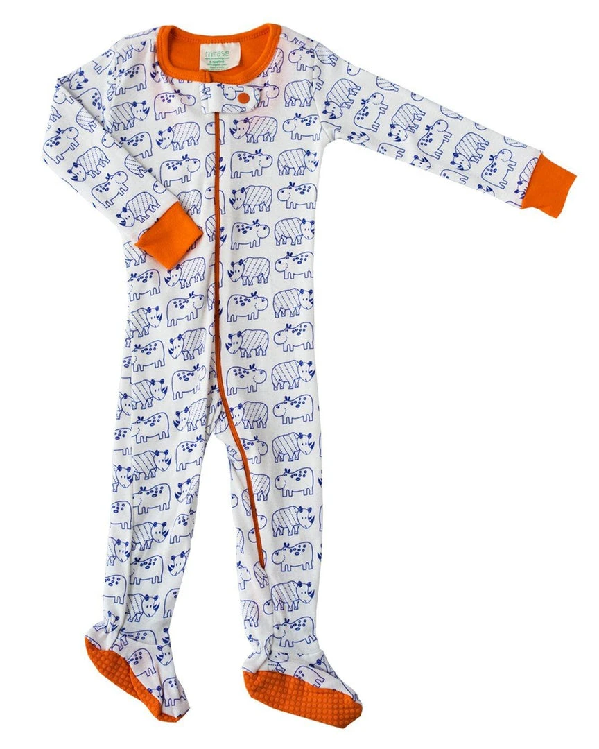 This easy zip-up footed onesies was designed with a dash of adventure. Orange accents in the cuffs, neck, zipper and feet. Grippy feet make exploration safe and fun while the soft organic cotton adds ultra comfort.