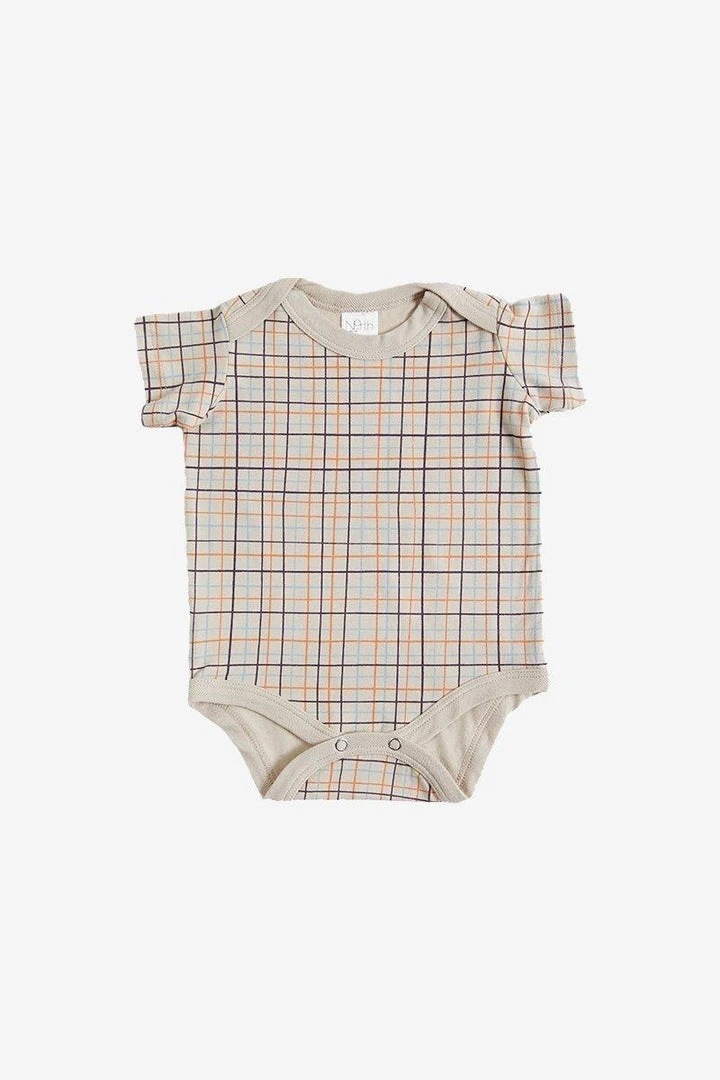 Super soft organic short sleeve onesie printed with a Grid print. Envelope neckline and a two-snap closure for easy baby changing.