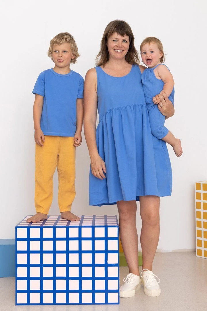 Oversized, comfy double cloth pants with pockets and a rib-knit waistband for comfort. Made in small productions in Los Angeles, CA. Available in baby and kids’ sizes.ย