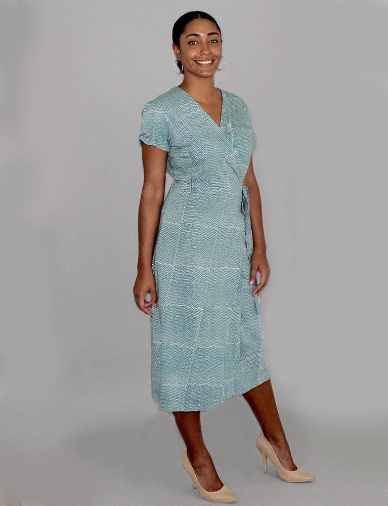 This full-length wrap dress is made of soft and breathable organic jersey cotton and features short-sleeves and side pockets. Your purchase helps provide a secure job with fair wages and a positive working environment for artisans in India and the United States.