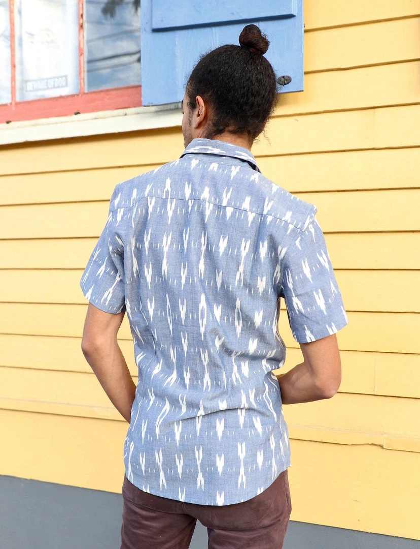 This short sleeve men’s button down shirt features a light blue geometric print. Gentle tapering at the waist with a straight and narrow profile and a broader fit in the shoulders gives this shirt the perfect fit. Due to the handmade nature of this item, slight color variation may occur.