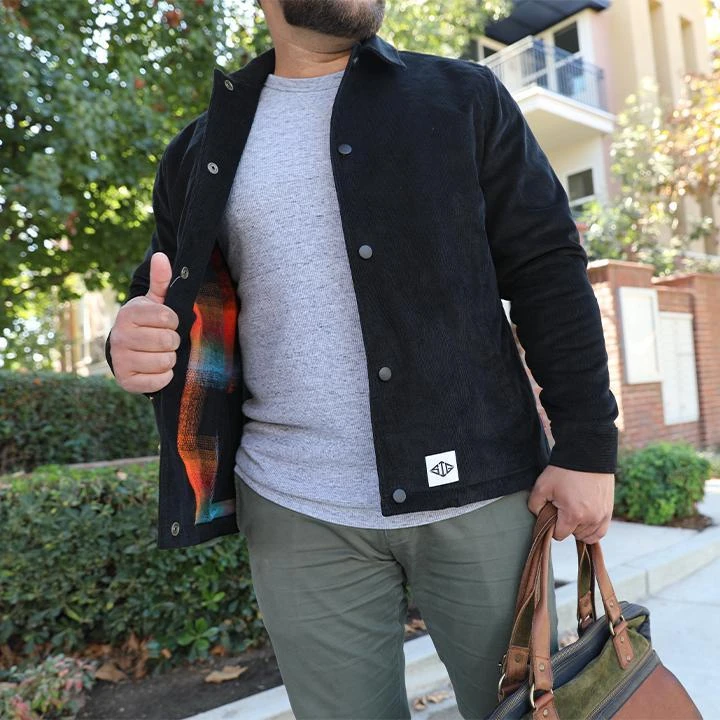 This corduroy jacket is a lightweight piece that’s perfect for layering. The cuffs feature an arrow-cut design that compliments the eye catching, color-matching snaps. The outside has two flat laying welt pockets. The inside seams have been finished and closed with chambray trim. Throw it on over jeans and a tee to create an elevated look.Â
