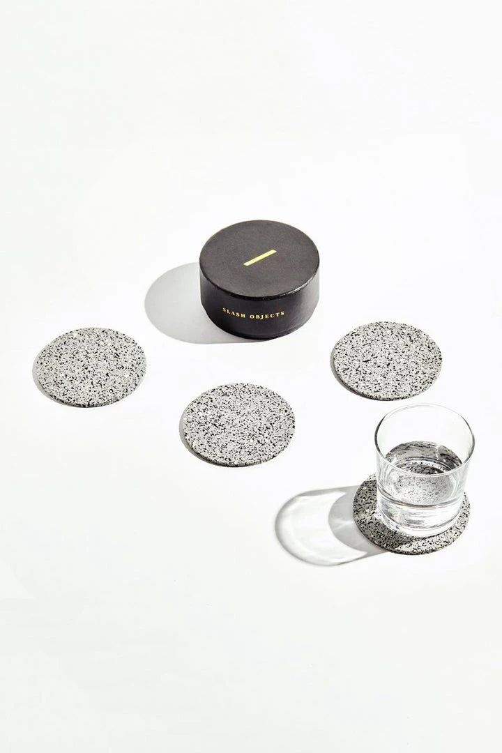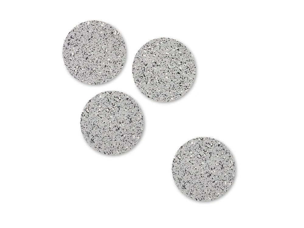 Set of four round coasters made of recycled rubber to protect your surfaces in style.