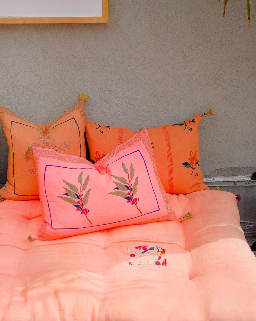 Handwoven by a small community of weavers from a village in Bengal and block-printed by master artisans from the city of Jaipur, the pillow surely has a luxurious look and feel.