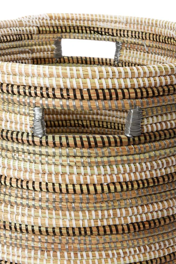 These laundry hampers are handwoven by more than 100 rural Wolof women. Crafting baskets allows women to earn income from the comfort of their community. Using abundant and renewable cattail stalks bound with salvaged plastic strips procured from a local mat factory, the women hand-weave each of these hampers. These handcrafted baskets may vary slightly as compared to the the photos, as each set is unique.