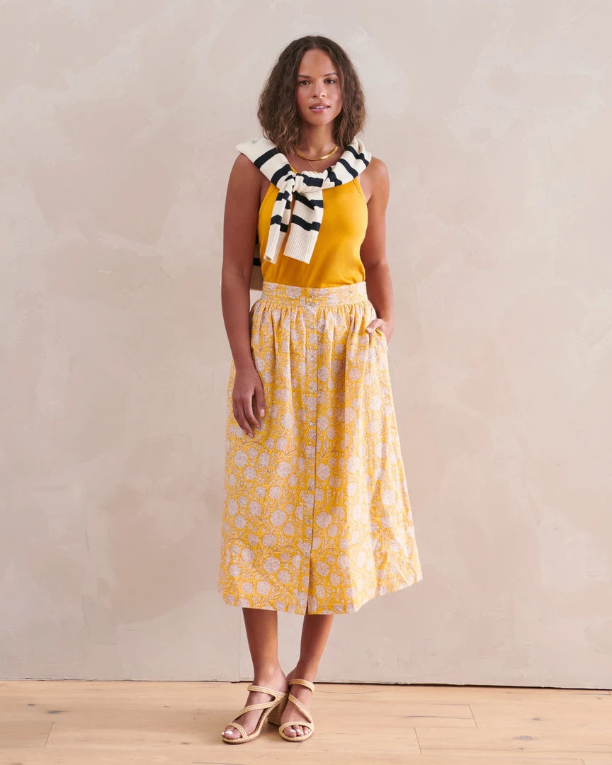 The midi-length Rhodes Skirt falls gracefully just below the knee with a cinched button waist and full A-line silhouette. Made from organic cotton and hand stamped with a bright and cheery Marigold block print.